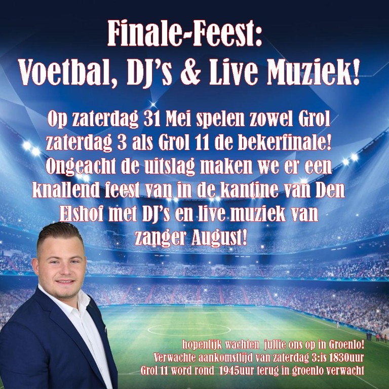's Avonds is er ongeacht de uitslag een knallend feest in Sportcafe Den Elshof. Grol Zat 3 wordt rond 18.30 uur terug verwacht en Grol 11 wordt rond 19.45 uur terug verwacht.