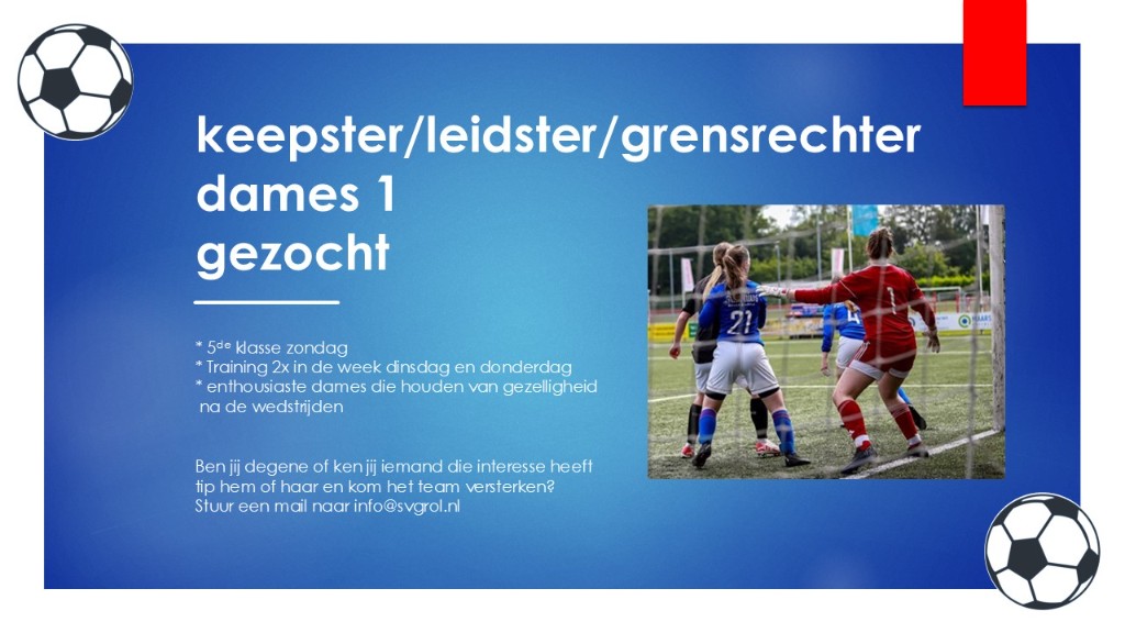 Het Dames 1 team van s.v. Grol is nog op zoek naar een keepster, leidster en een assistent-scheidsrechter. Heb je interesse of weet je iemand stuur dan een e-mail naar info@svgrol.nl.