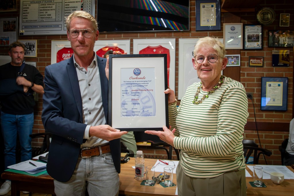 Het hoogtepunt van de avond was toch wel de benoeming van Annelies Porskamp tot erelid van s.v. Grol. In een prachtige toespraak motiveerde voorzitter Stan Raben deze keuze en typeerde Annelies als de Moeder van de s.v. Grol familie. Deze benoeming werd na het afsluiten van de vergadering goed gevierd samen met de aanwezige leden als ook de uitgenodigde familie Porskamp-Rensing.