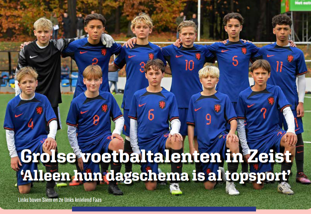 Midden in de Zeister bossen vlakbij Utrecht ligt de KNVB campus. Dit indrukwekkende bolwerk van de Koninklijke Nederlandse Voetbal Bond heet in de wandelgangen ook wel de middenstip van voetballend Nederland. Hier staat het hoofdkantoor van de KNVB, een tikkeltje ouderwets het bondsbureau genoemd. Hier bevindt zich natuurlijk ook het trainingscentrum waar de spelers van Oranje bij elkaar komen en hun trainingen afwerken. Op een kille novemberdag ben ik op de campus om twee Grolse jongens te zien voetballen. Siem Baks en Faas Gockel (zoon van collega-redacteurRik) spelen voor de tweede keer in drie weken tijd een paar oefenwedstrijden bij de Futures O15.